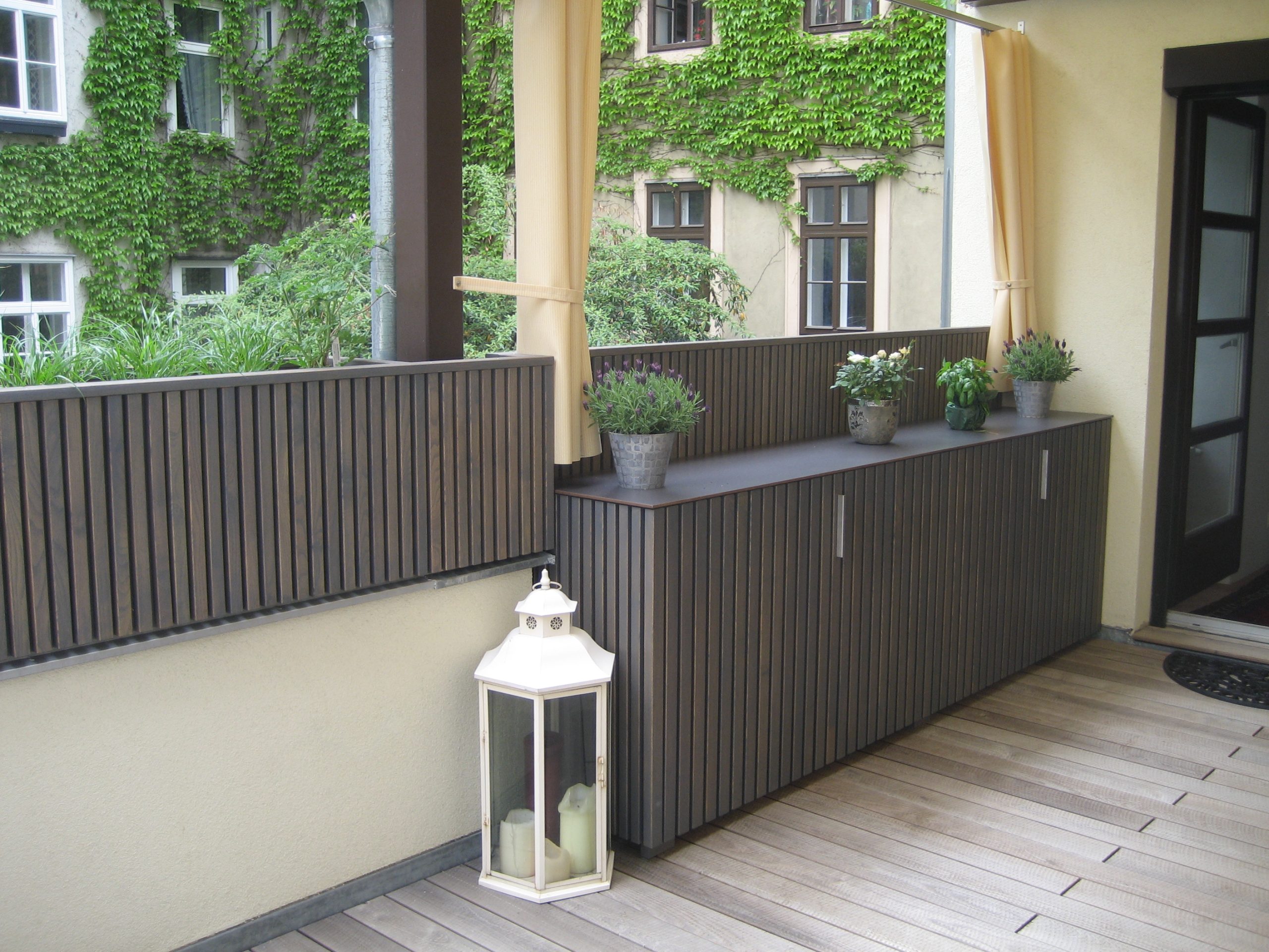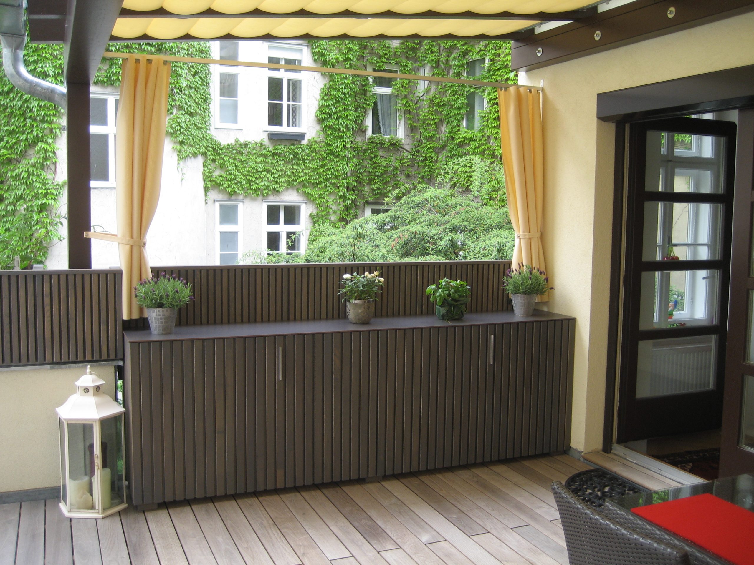 Holzdielen in Thermoesche Champagne vorvergraut mit integrierten Lichtspots; 4-türige Gartenanrichte Tavola und maßgefertigte Pflanztröge Tavola auf Brüstungsmauer (um die notwendige Höhe laut Bauordnung zu erreichen) in Ausführung Akazie/Robinie Steingrau; Raffbeschattung und Balkonvorhang im Terrassendach.