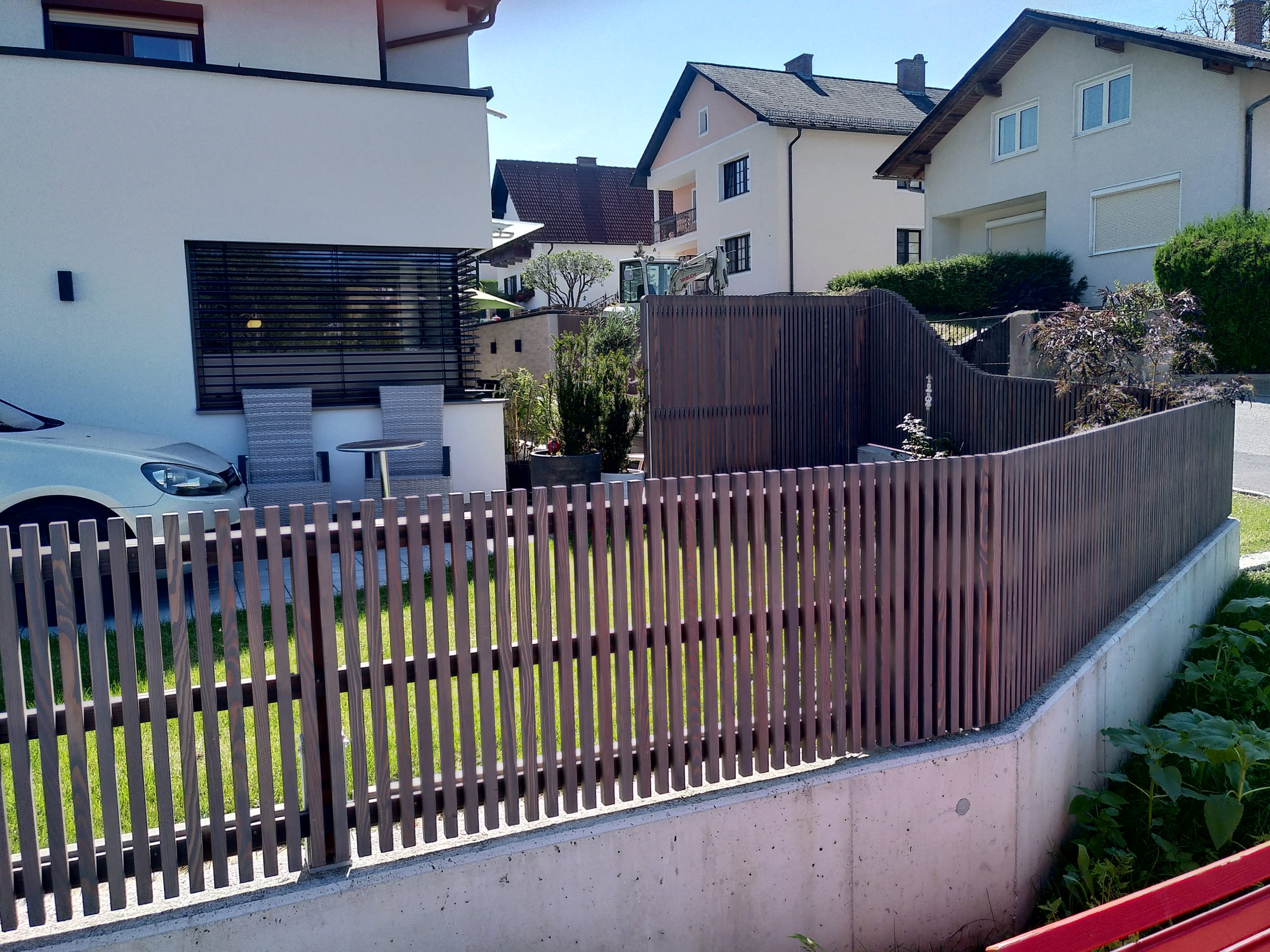 Kombinierte Errichtung eines Duo- und Leistenzauns. Im oberen, häufiger genutzten Teil des Gartens, wurde der Duo-Zaun ausgewählt während im unteren Bereich unser klassischer Leistenzaun montiert wurde. Beide Varianten ausgeführt in Lärche steingrau geölt.