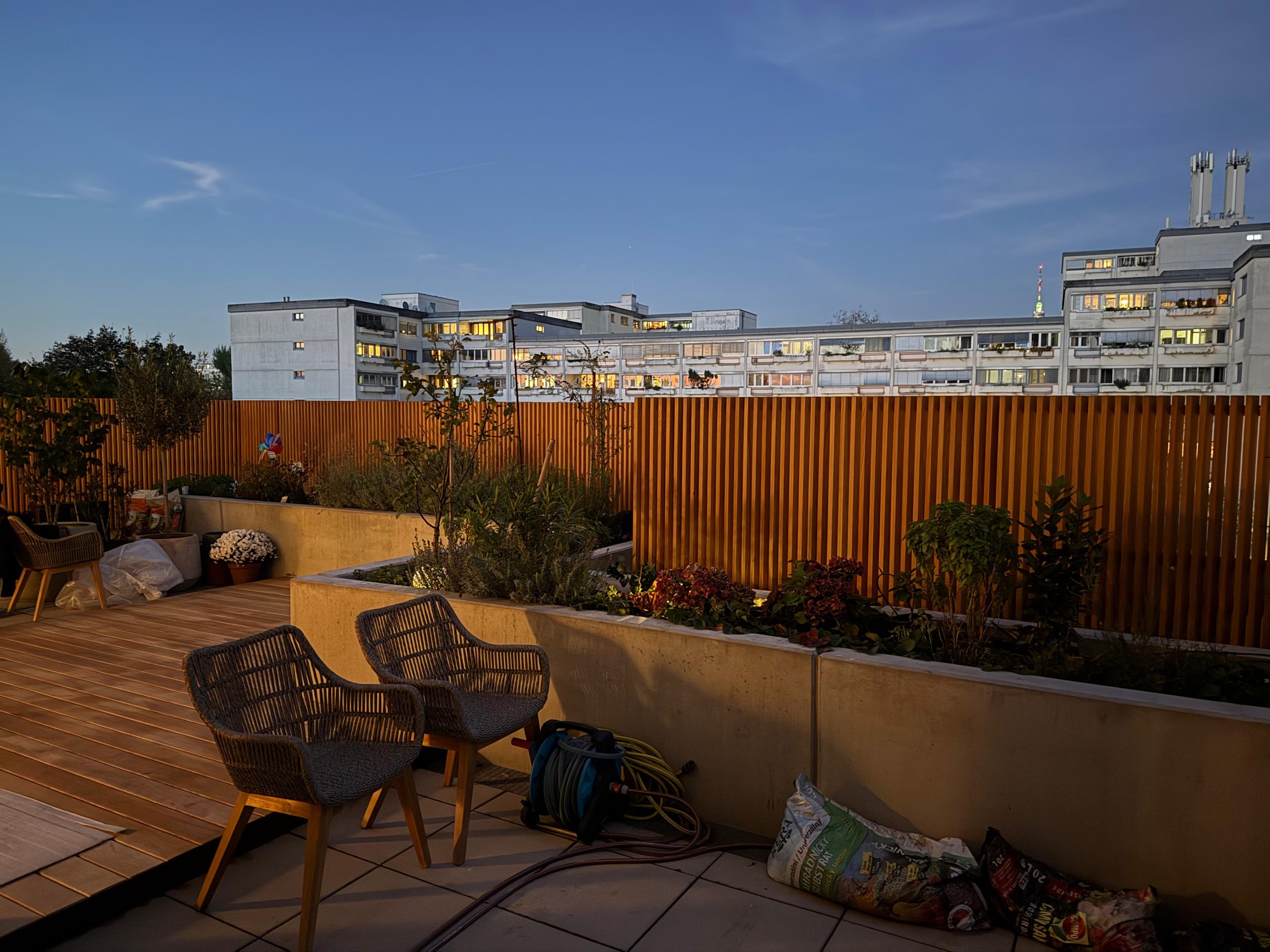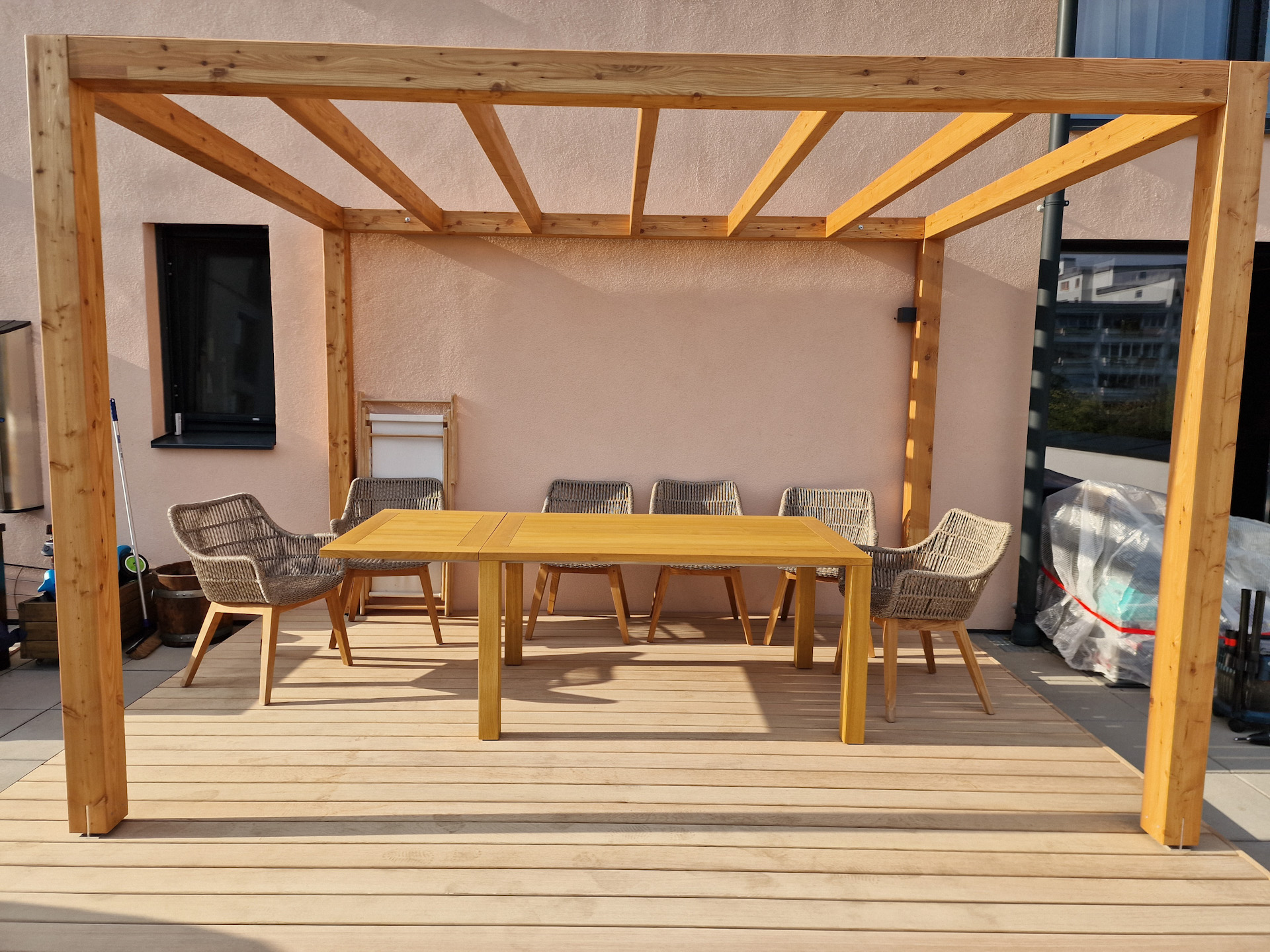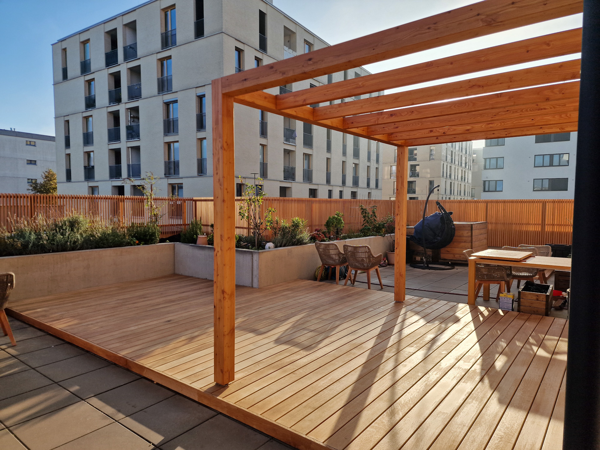 Ausstattung einer Dachterrasse mit Pergola, Eichenboden, Schräglamellenzaun und Pure-Tisch. Die Montage erfolgte in enger Abstimmung mit dem Kunden und wurde innerhalb einer Woche durchgeführt.