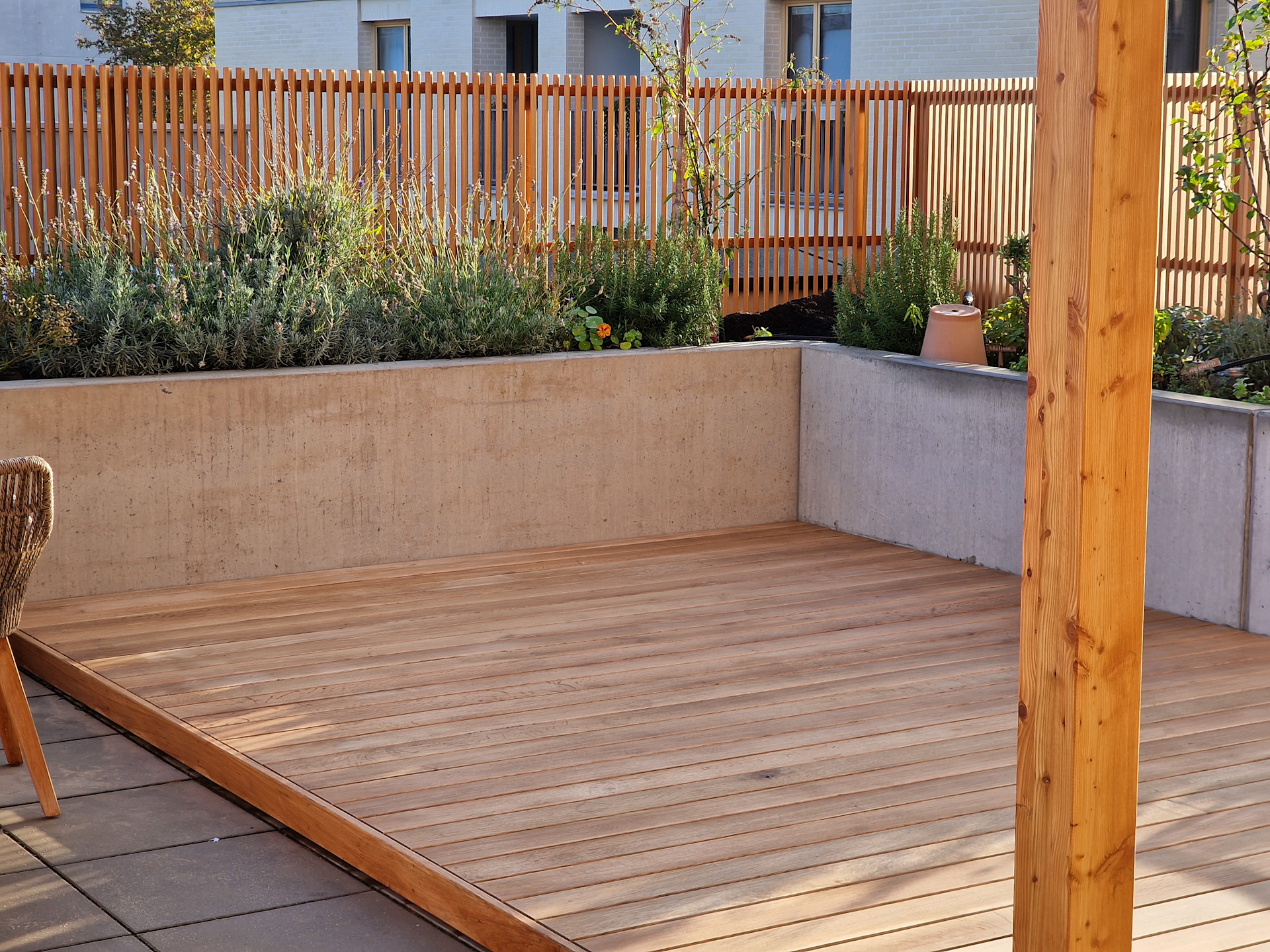 - Schräglamellenzaun: Lärche mit Lärchenöl geölt