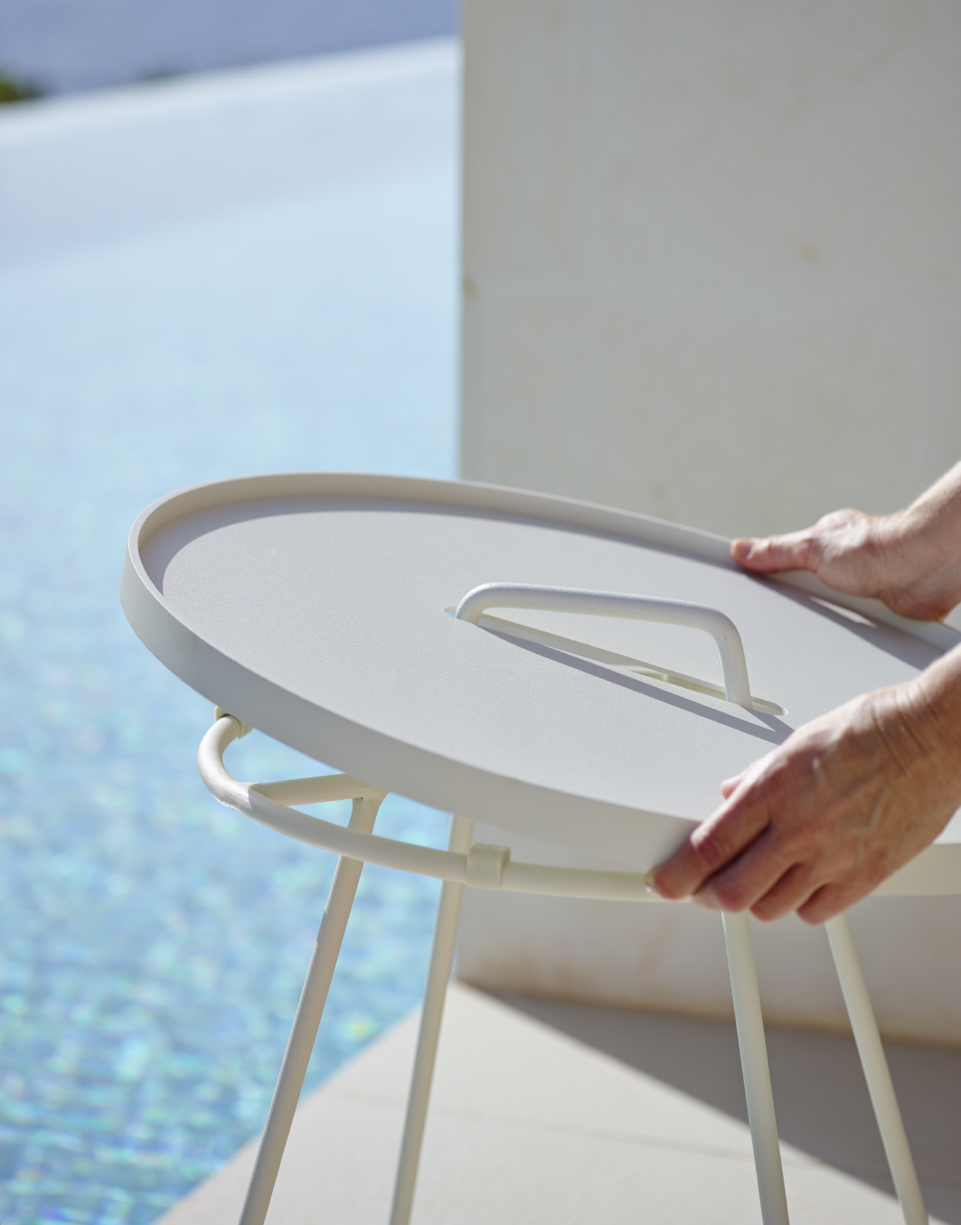 Das Tischchen On-the-Move ist mit einem Handgriff versehen und kann einfach und schnell dort hingestellt werden, wo es gebraucht wird. Die runde Tischplatte ist abnehmbar und als praktisches Tablett einsetzbar.