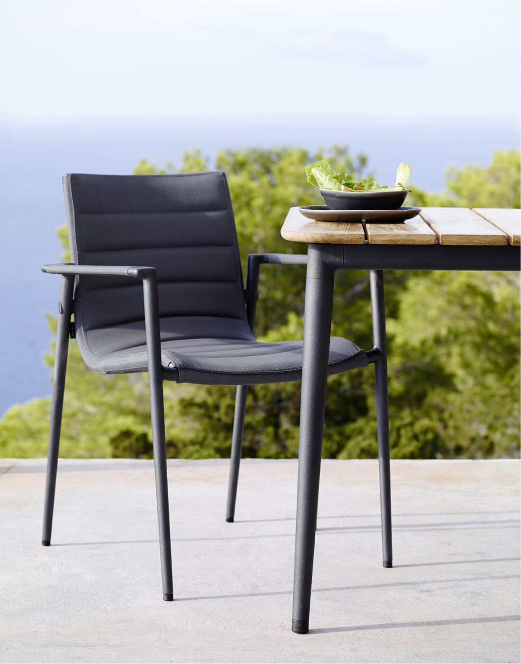 Komfortabel, leicht und stapelbar: Der ansprechende Gartenstuhl Core kombiniert das einzigartige Cane-line AirTouch® Material mit QuickDry® Form. Entstanden ist ein „weicher“ Look, der normalerweise Möbeln für den Innenbereich vorbehalten ist. Erhältlich mit und ohne Armlehnen in den Farben Taupe und Grau.