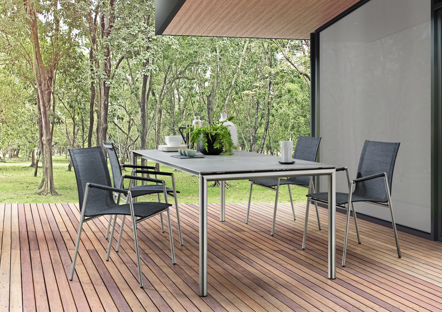 | Gestell: Edelstahl Rundrohr | Bespannung: Batyline Eden black |