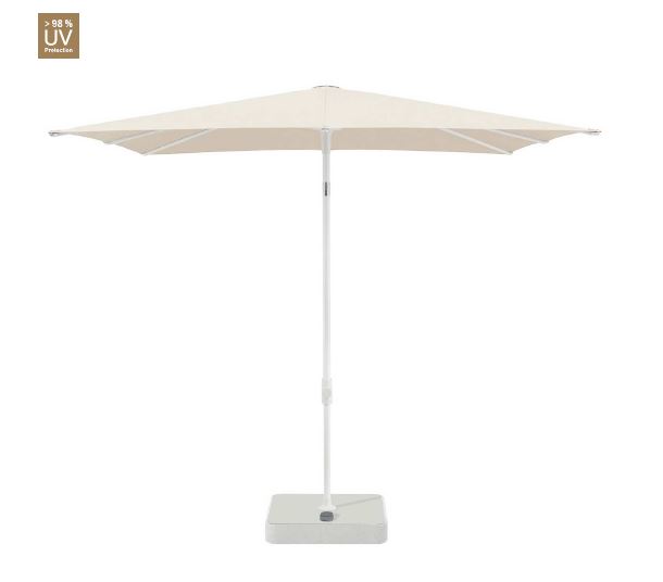 Die flachen Streben mit raffinierten Kugelgelenken sorgen in Kombination mit dem in weiss oder anthrazit pulverbeschichteten Aluminiumprofil für die moderne, schwebende Optik des Schirmdachs. Mechanisches Herzstück ist dabei die clever versteckte Technik im smarten Schieber. Wird dieser nach oben geschoben, lässt sich der Schirm im Nu manuell öffnen. Seine Höhenverstellung mit Drehknopf ist stufenlos bis zu 50 cm. Das Schirmdach neigt sich dank Kippgelenk mit einem Handgriff bis zu 32° nach links oder rechts. Durch das innenliegende Standrohr wirkt der Schirm wie aus einem Guss mit dem Sockel.