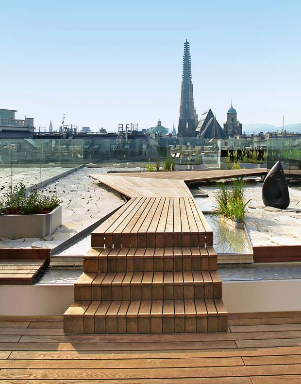 Bodenbeläge aus Holz harmonieren in jedem Garten mit der grünen Umgebung. Holzböden heizen sich nicht auf, sie lassen sich leicht und sauber verlegen, sind individuell gestaltbar und für jedes Gelände geeignet. Wir bieten Ihnen verschiedene Möglichkeiten zur Verlegung der Holzdielen an: sichtbare Verschraubung mit Edelstahl (dekorativ und leicht demontierbar), verdeckte Systeme oder vorgefertigte Elemente für rasches Verlegen vor Ort.