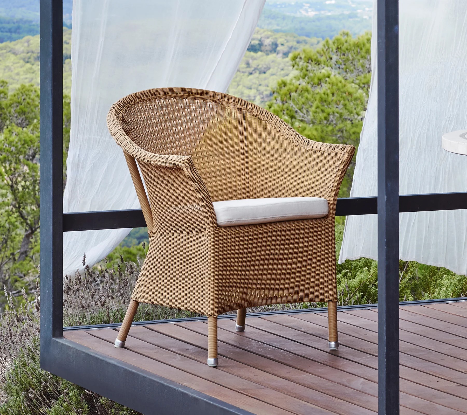 Die Serie Lansing im klassischen, romantisch-ländlichen Look umfasst Stühle, Bänke und Tische und ist in den Farben Natur, Taupe und Sand erhältlich. Der groβe Gartensessel passt zu dem schönen Lansing Gartensofa, das Ihnen sowohl einen groβen Komfort beim Essen als auch entspanntes Sitzen für lange Sommerabende bietet. Der Serie ist aus witterbeständiger Cane-line Weave® Faser handgeflochten und äusserst pflegeleicht.