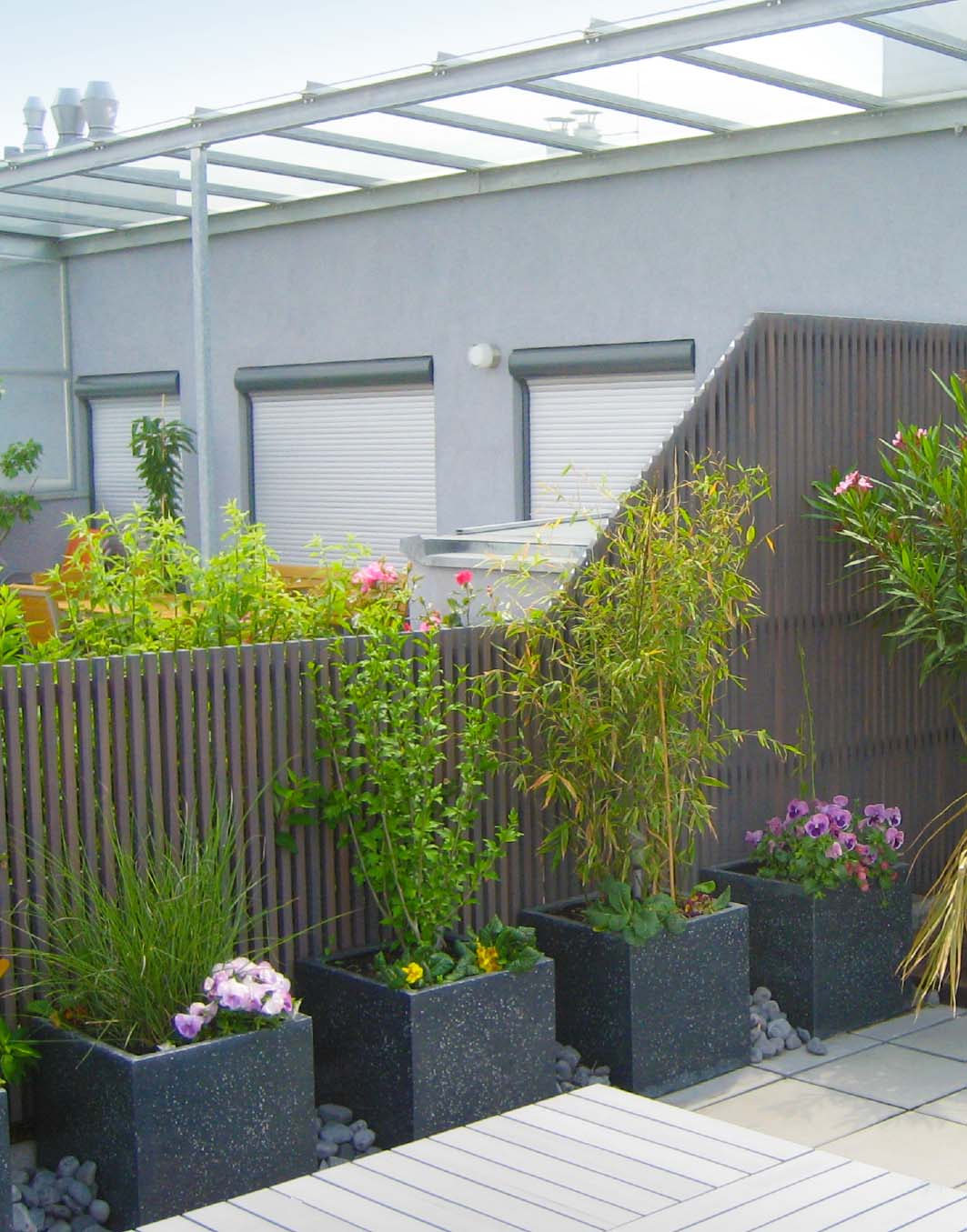 Wir schneidern Ihre Gartenausstattung nach Maß. Individuell gestaltet, exakt geplant, präzise umgesetzt – Holzboden, Pflanzbehälter, Sichtschutz, Gerätehaus, Zaun, Terrassenmöbel und Terrassendach – in einem Design, stets ein harmonisches Ensemble.