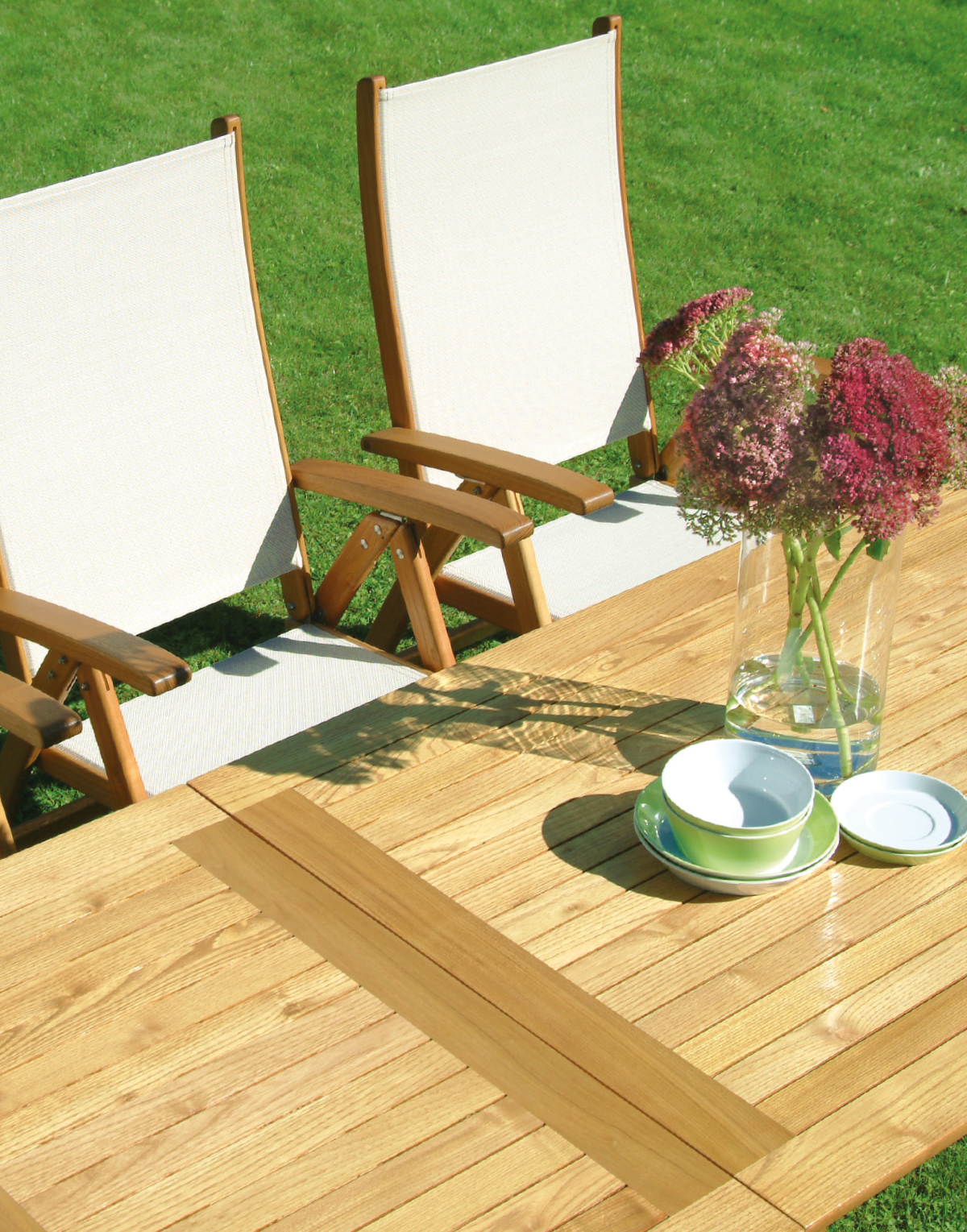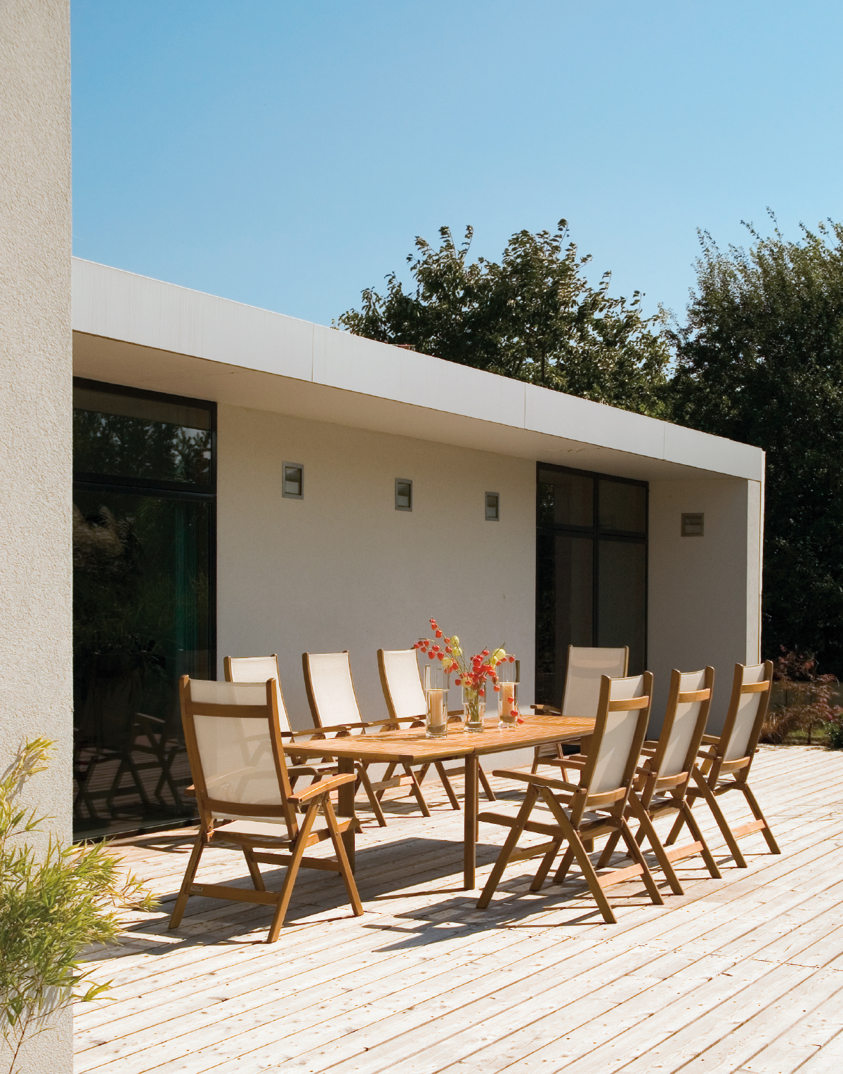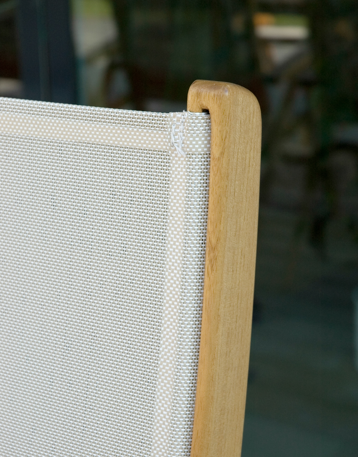 Sitzkultur in höchster Form: Die harmonische Verbindung von sonniger Akazie/Robinie mit dem warm anmutenden Batyline® Gewebe lässt sich mit moderner Architektur ebenso kombinieren wie mit üppigem Grün.