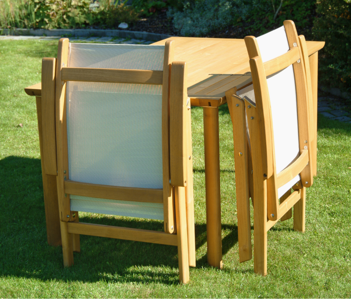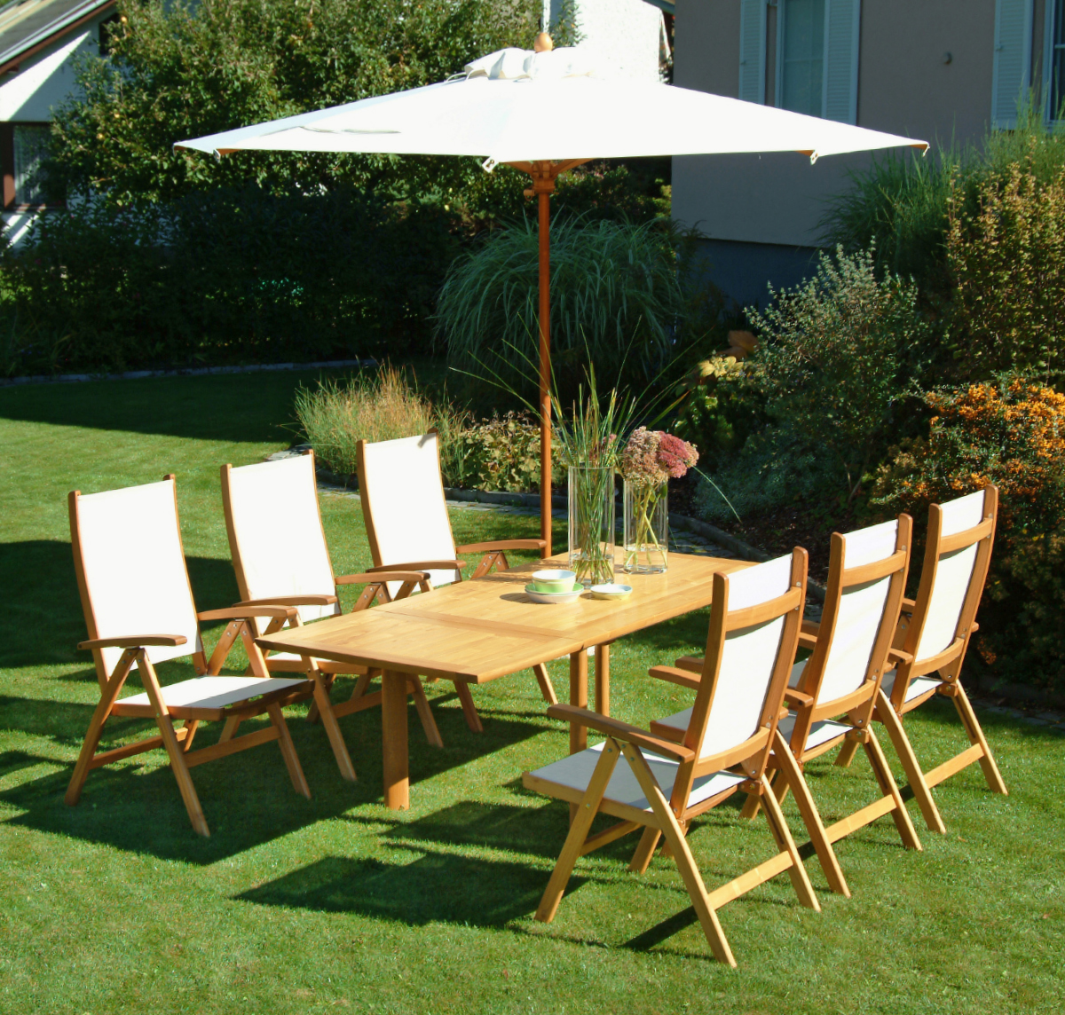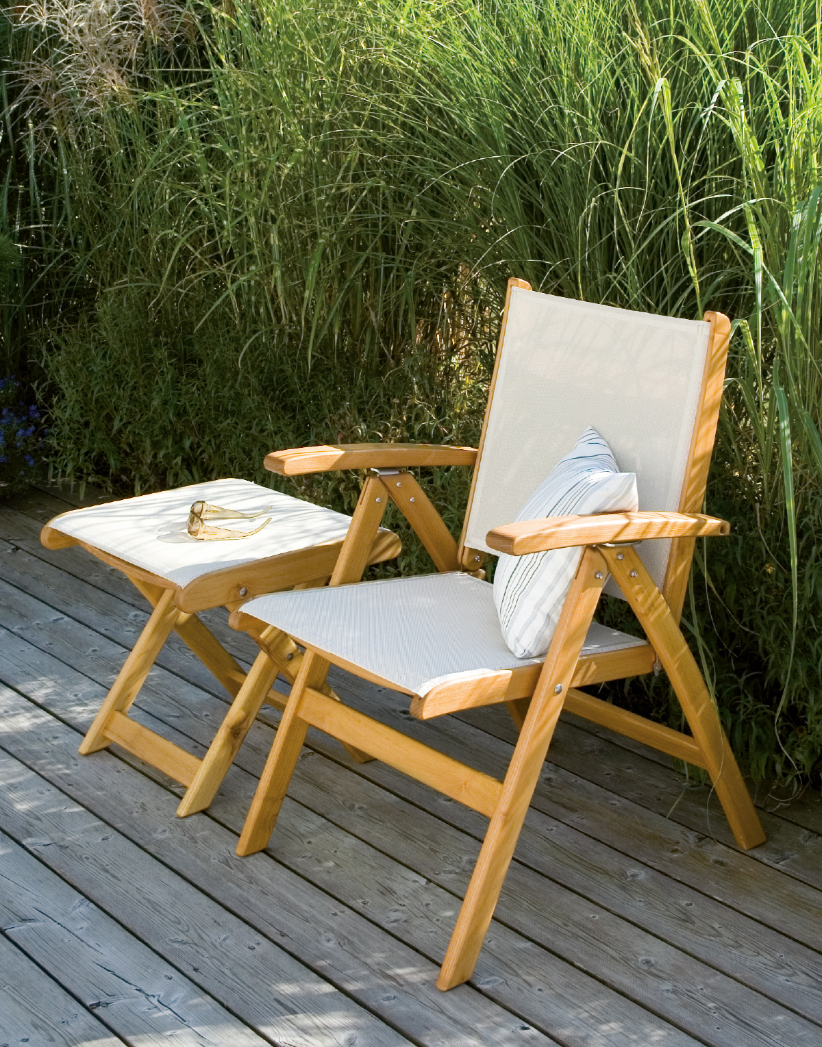 Sitzkultur in höchster Form: Die harmonische Verbindung von sonniger Akazie/Robinie mit dem warm anmutenden Batyline® Gewebe lässt sich mit moderner Architektur ebenso kombinieren wie mit üppigem Grün.