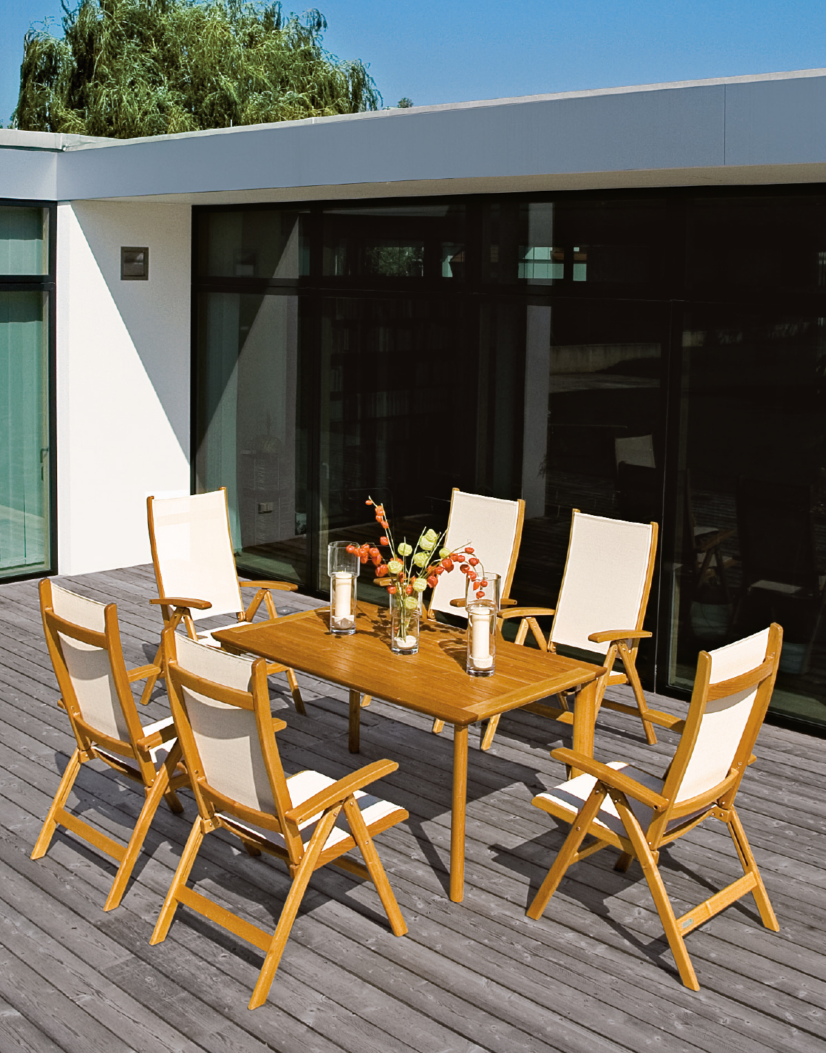 Das feine Gewebe passt sich dem Körper an, ist UV-beständig, wetterfest und abwaschbar. Die komfortablen, leichten Stühle sind in der Rückenlehne 5-fach verstellbar und klappbar. Durch die massiven Armstützenbeschläge ist sicherer Stand in jeder Position garantiert.