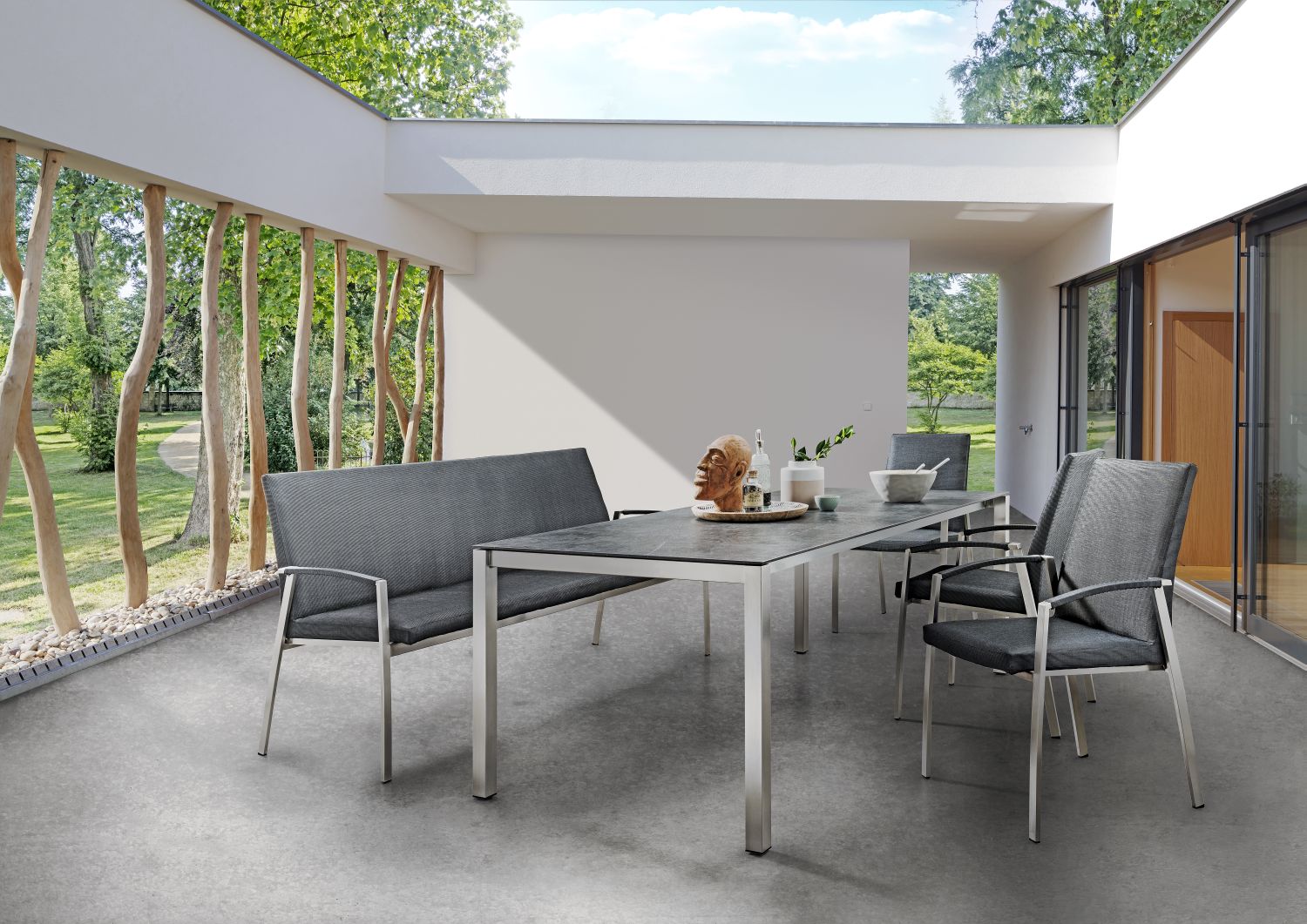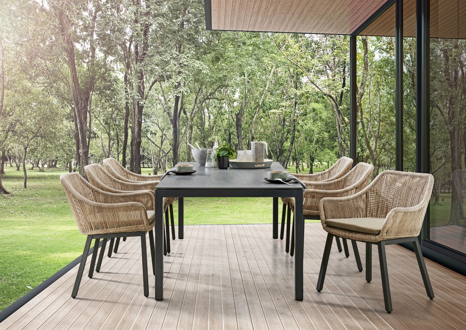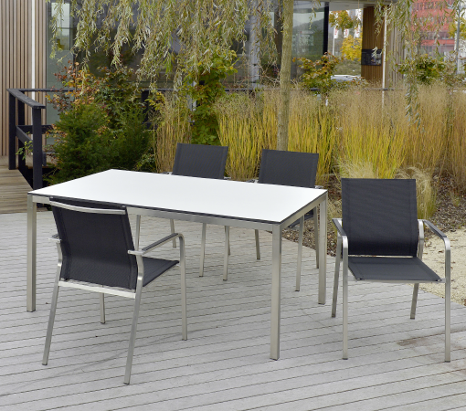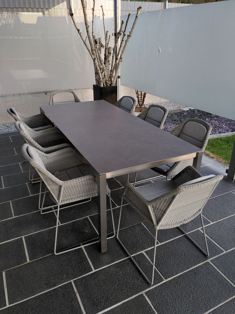 Alle Tische können hervorragend mit Holz-, Textilene– und Geflechtmöbel kombiniert werden.