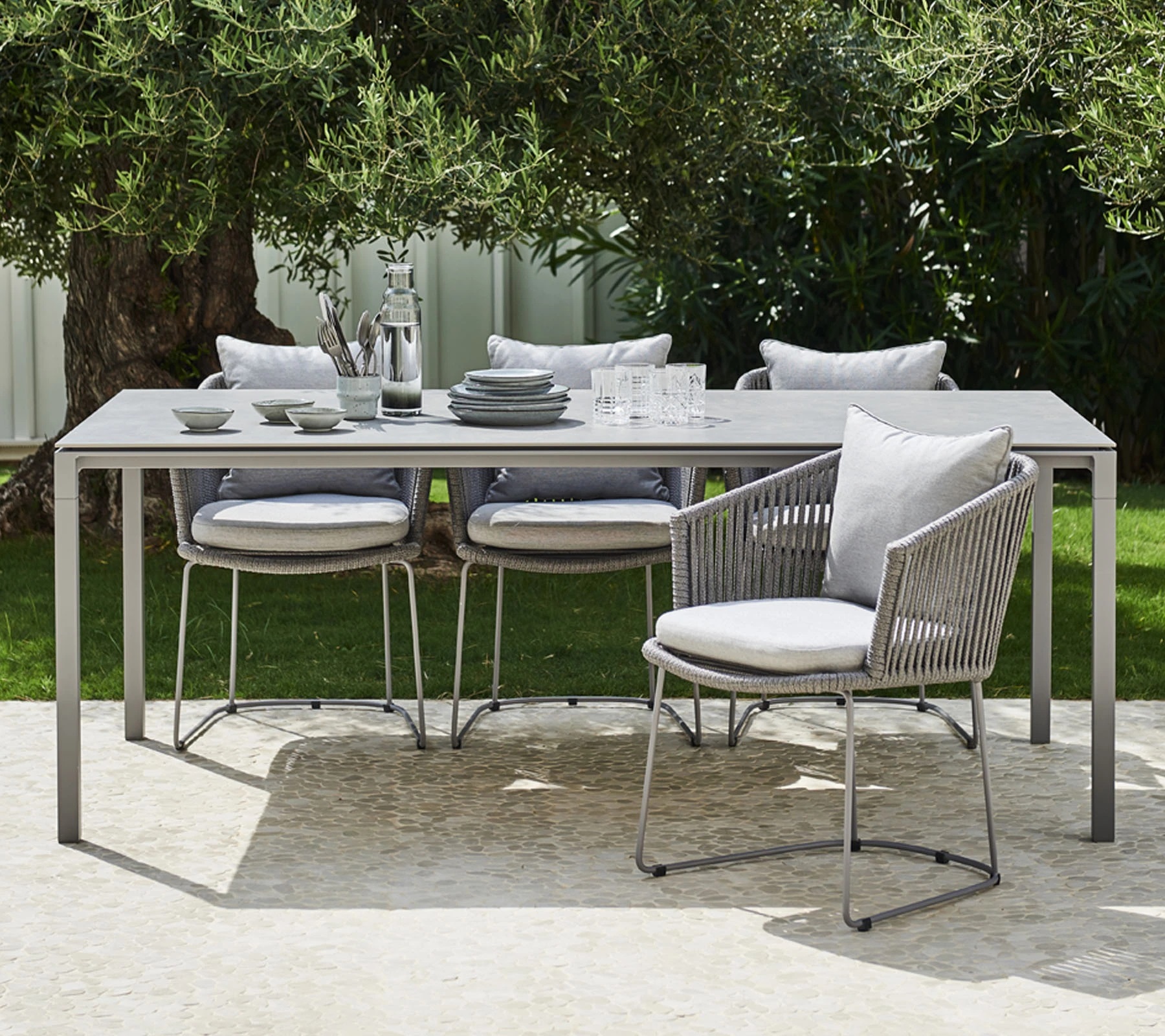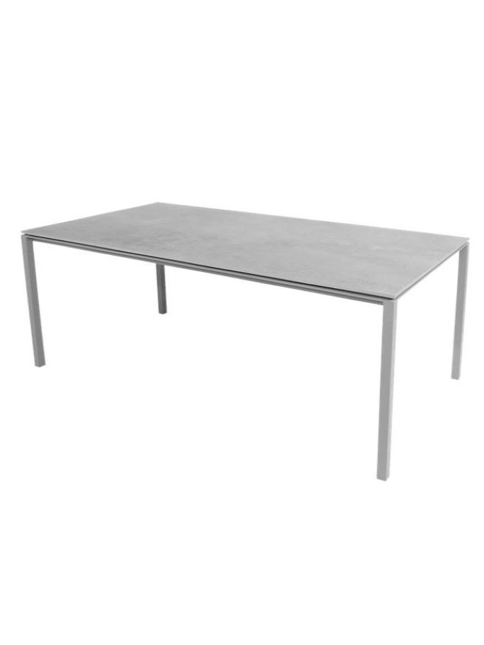 Die Tischplatte “Fossil grey” ist aus Keramik hergestellt, der schlichte und stilvolle Rahmen besteht aus pulverlackiertem Aluminium. Der Pure-Tisch ist leicht zu pflegen, hat eine kratzfeste Tischplatte und kann mit einem feuchten Tuch abgewischt werden. Der Tisch ist UV-beständig und kann daher bei jeder Witterung im Freien stehen.