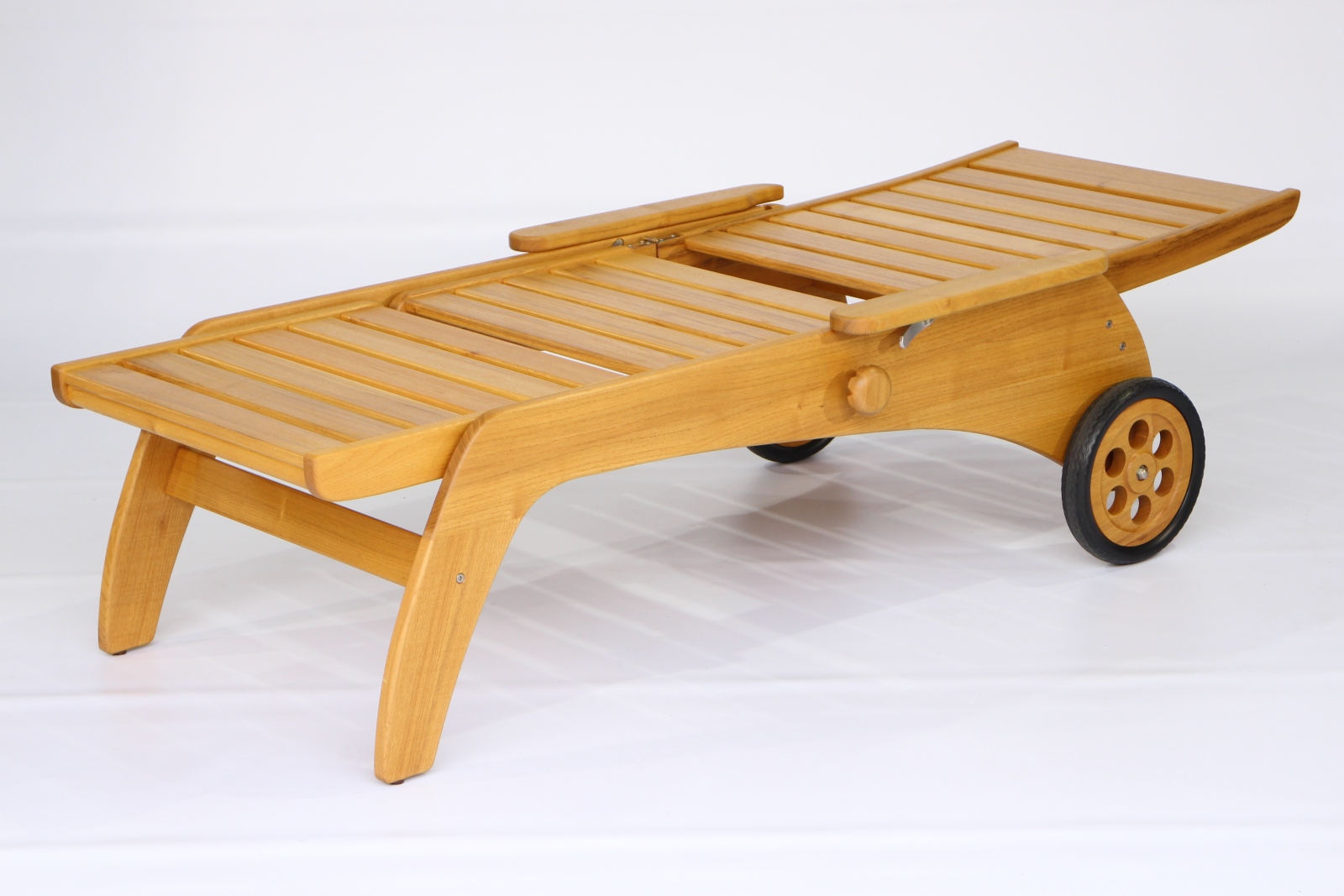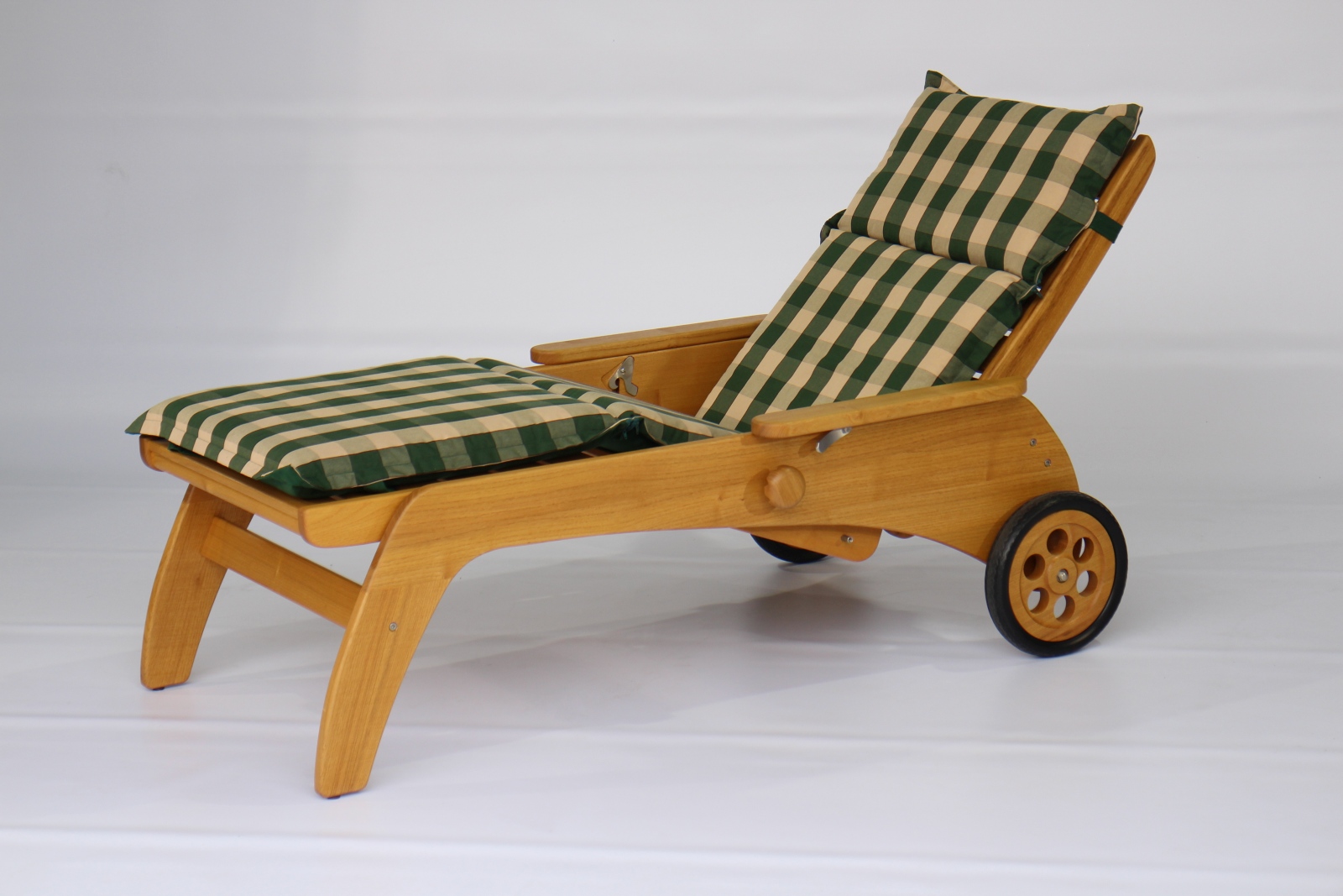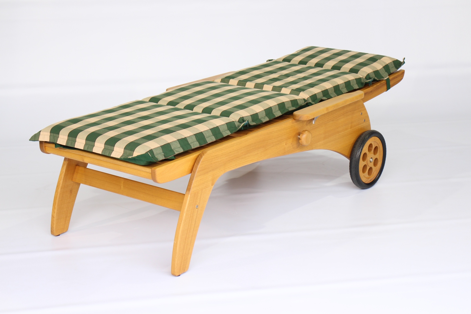 Unsere bequeme Rollliege aus Massivholz gibt es auch mit 46 cm Sitz- bzw. Liegehöhe. Stufenlos verstellbar, Ausführung Eiche und Akazie / Robinie massiv, geölt oder unbehandelt.
