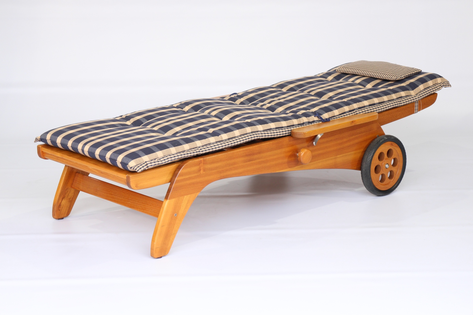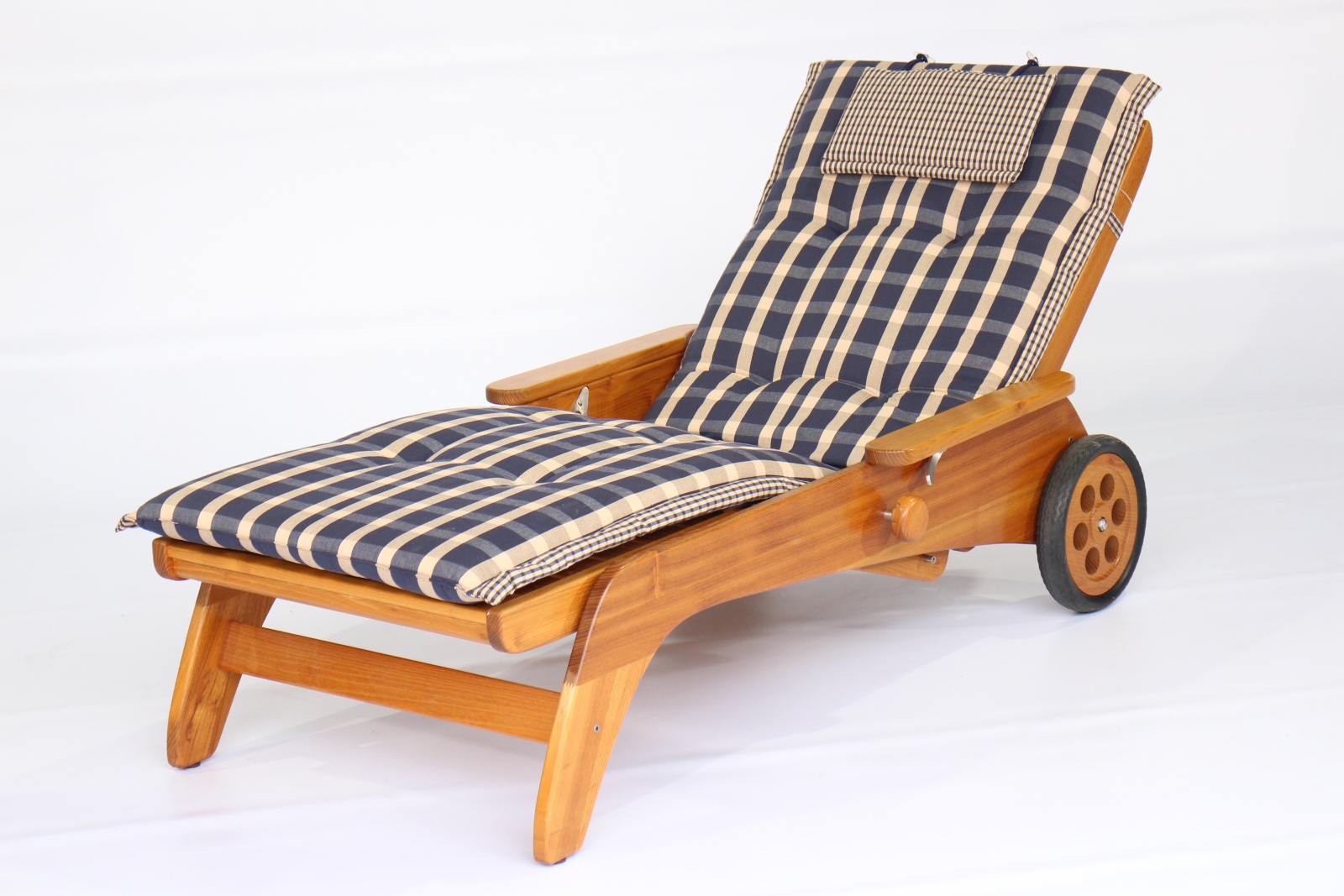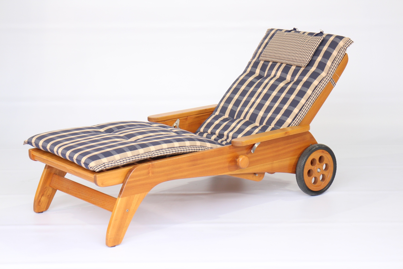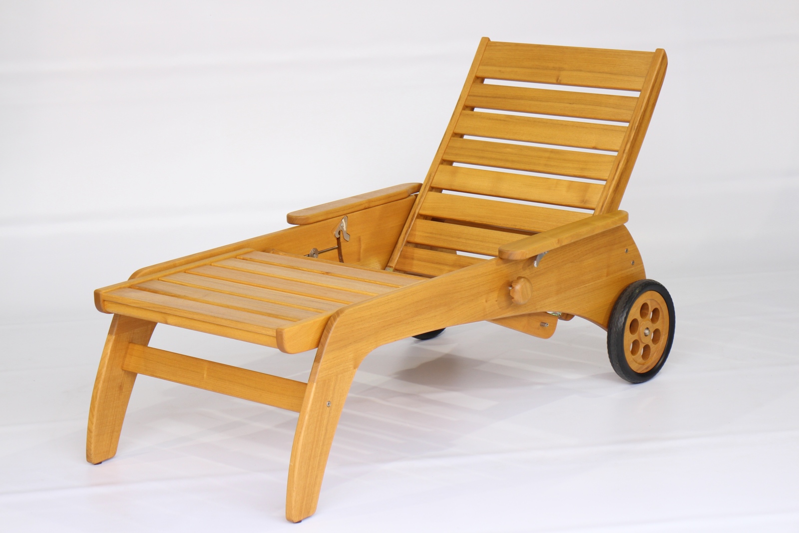 Unsere bequeme Rollliege aus Massivholz gibt es auch mit 46 cm Sitz- bzw. Liegehöhe. Stufenlos verstellbar, Ausführung Eiche und Akazie / Robinie massiv, geölt oder unbehandelt.