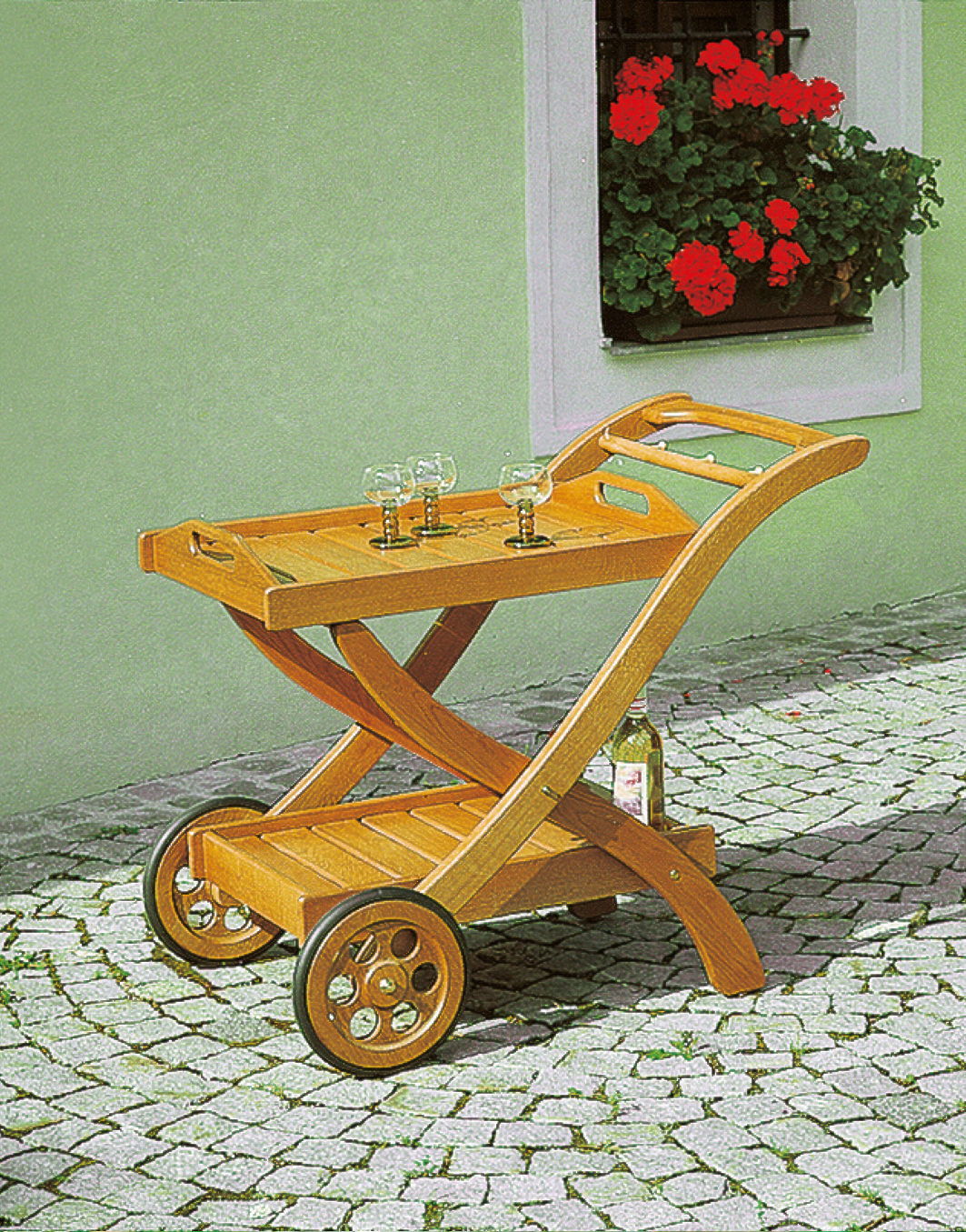 Das Tablett des eleganten Servierwagens ist abnehmbar, Flaschenregal und Hakenleiste sorgen für Ordnung. Für die großen, gummibereiften Räder ist kein noch so holpriger Weg ein Hindernis.