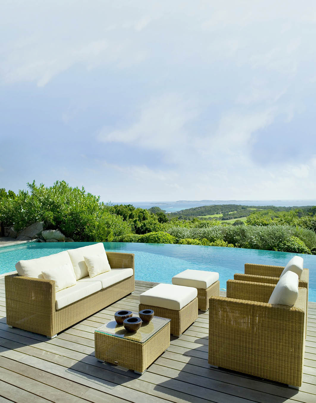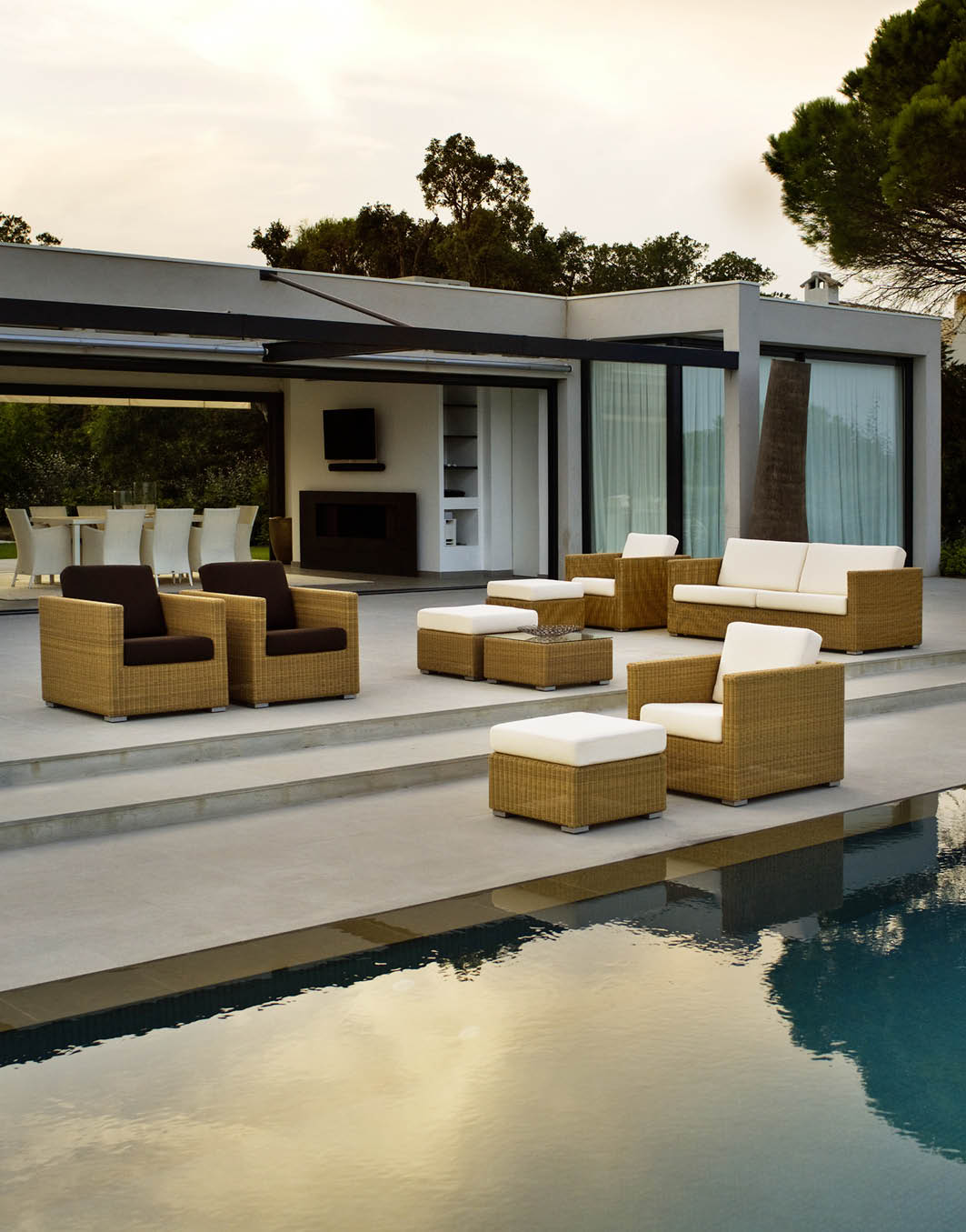 Klare Linien im klassischen Lounge-Look: Die Serie Chester besteht aus Sofa, Sessel und Hocker bzw. Beistelltisch und bietet ein entspanntes Ambiente, das sich auf der Dachterrasse genauso gut macht wie im Garten.