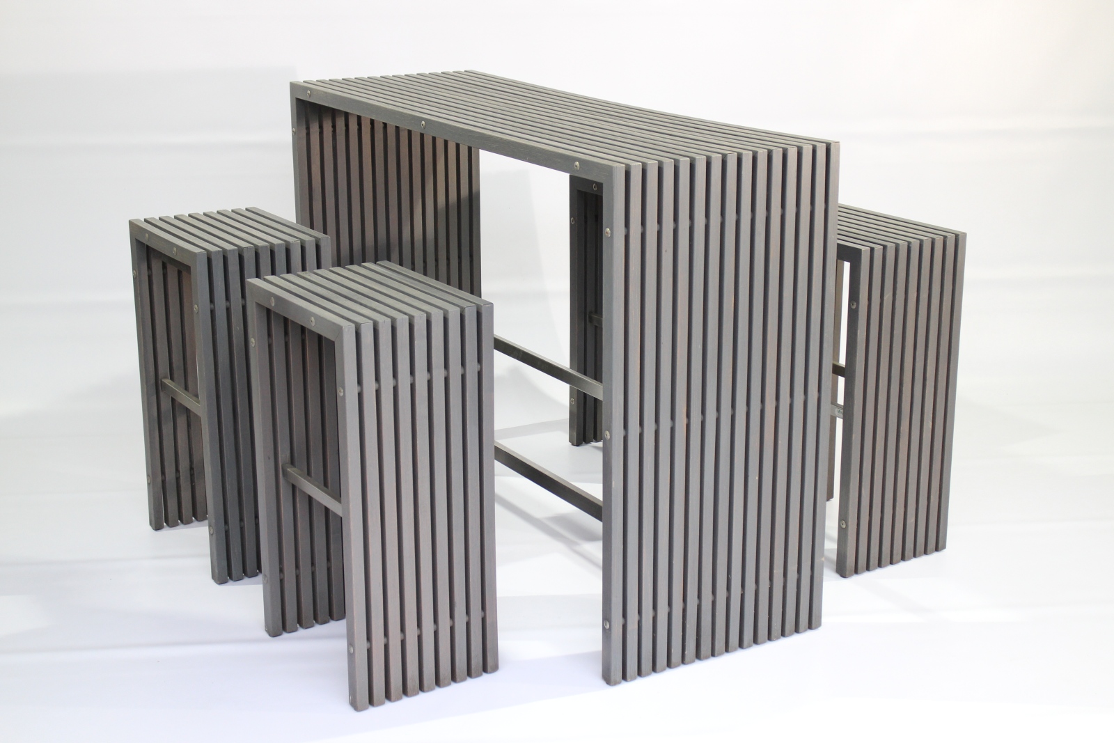 Die moderne Sitzgruppe Tavola besticht durch die konsequente Optik, das klare und freundliche Design lädt zum Verweilen ein. Tisch, Bänke und Hocker sind aus widerstandsfähiger Akazie/Robinie gefertigt, die transparent-graue Lasur lässt die feine Holzstruktur durchscheinen.