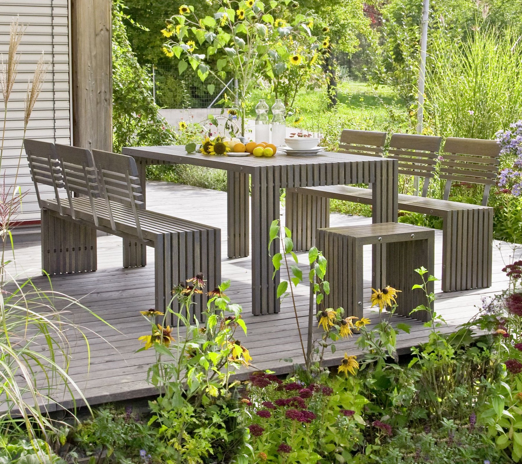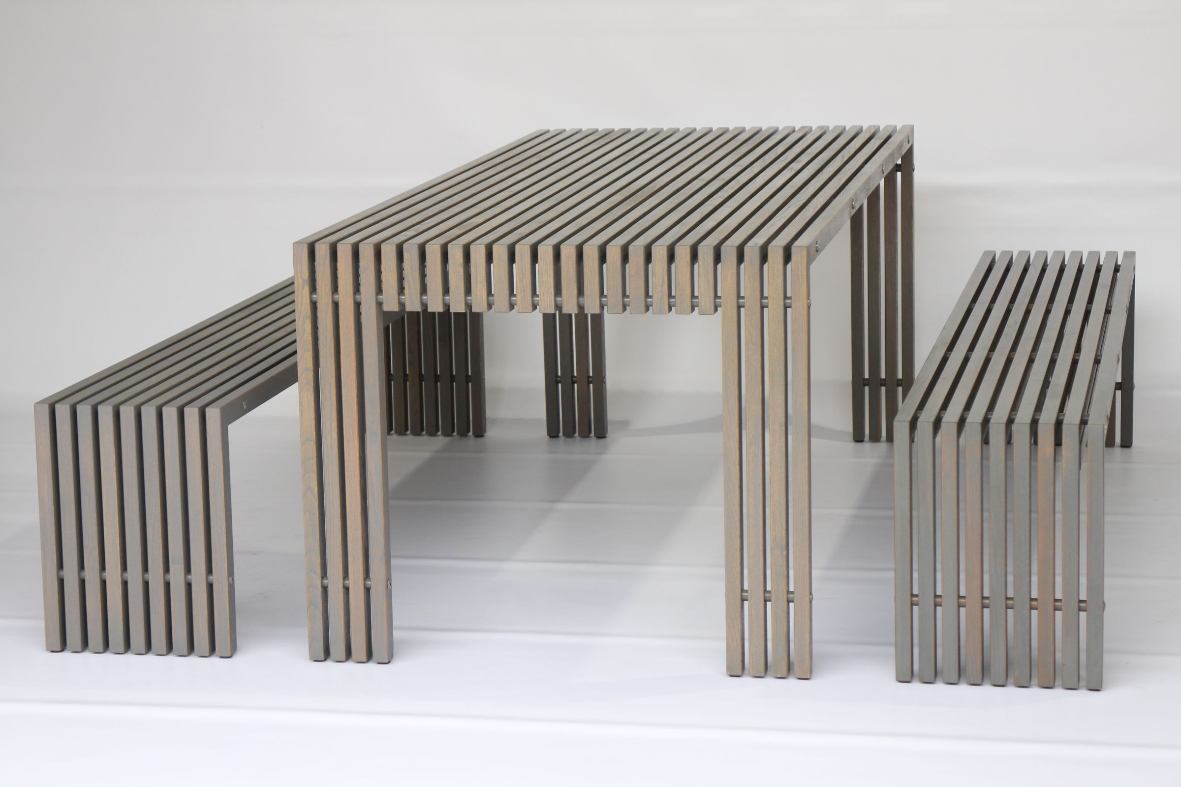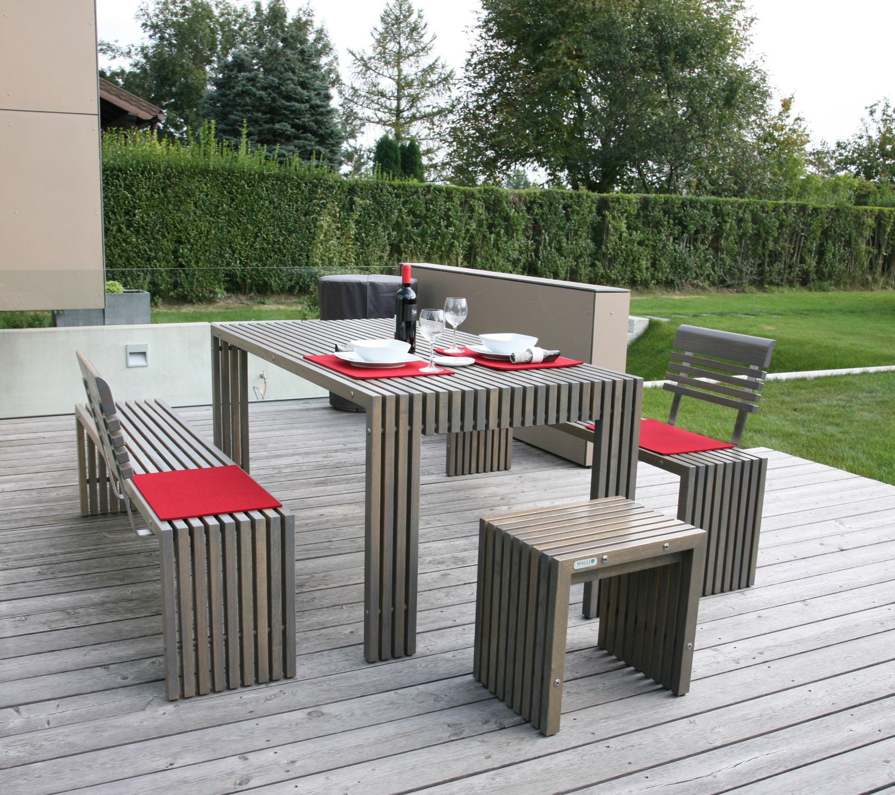 Tisch und Bank sind auch in frei wählbaren, maßgefertigten Längen erhältlich.